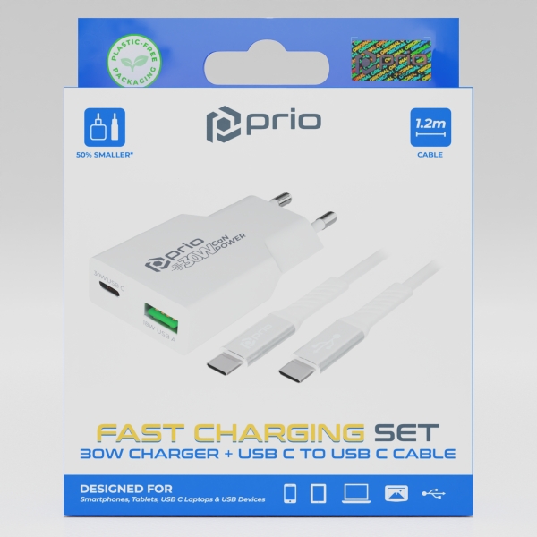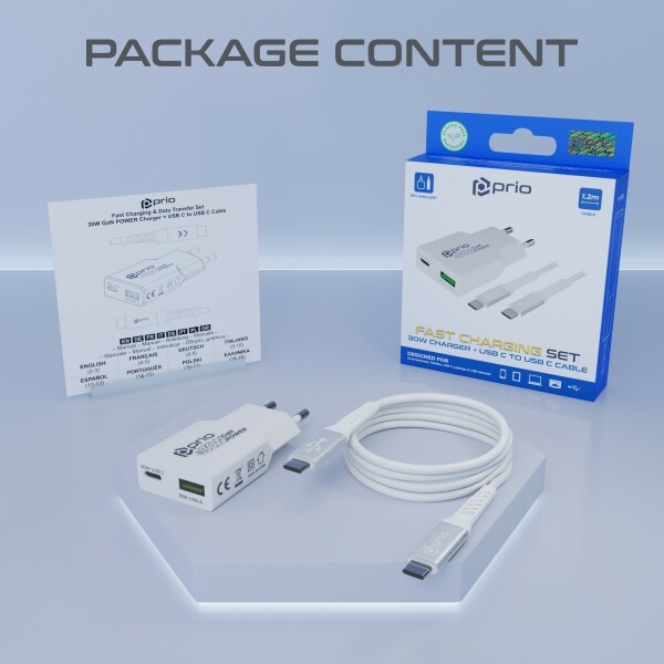 Cestovní nabíječ Prio GaN Power, 1x USB C 1x USB A, Fast charging 30W, kabel USB C na USB C, bílá