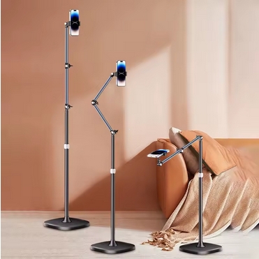 stabilní podlahový stojan s flexibilním ramenem a otočným držákem pro telefon. Díky dvoustupňovému kloubovému rameni a 360° otočnému klipu umožňuje snadné nastavení úhlu pro natáčení shora, zespodu i v běžné poloze. Pevná základna o průměru 26 cm zajišťuje maximální stabilitu a zabrání převrácení. Držák telefonu s rozsahem 60–92 mm je kompatibilní s většinou smartphonů do velikosti 6,5 palce. Výška stojanu dosahuje až 1,7 m, což ho činí ideálním pro streamování, videohovory, natáčení vlogů nebo sledování videí.