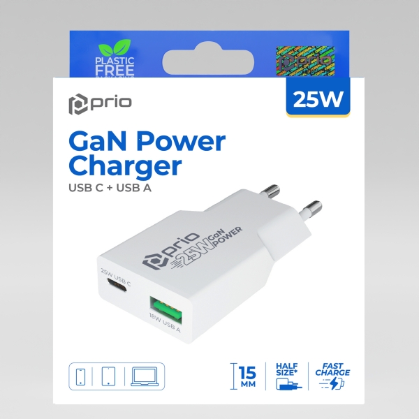 Cestovní nabíječ Prio Gan Power, 1x USB C 1x USB A, Fast charging 25W, bílá
