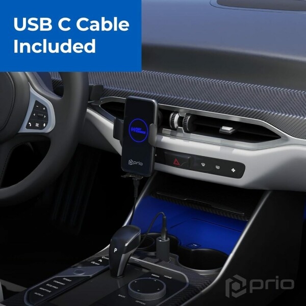 Držák do auta Prio Fast Charge, do větrací mřížky, indukce 15W, kabel USB A na USB C, černá
