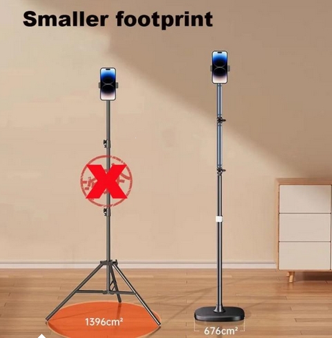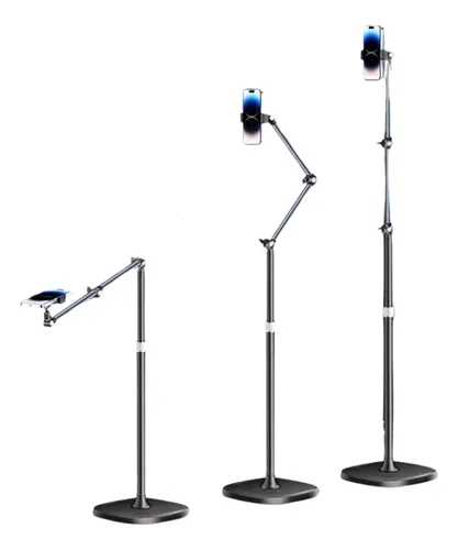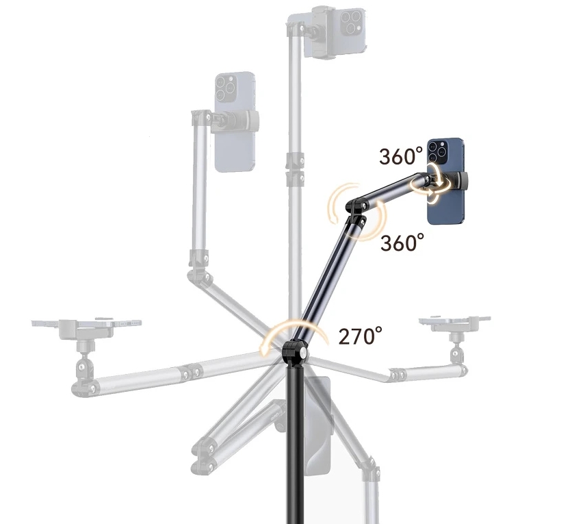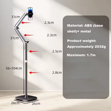 stabilní podlahový stojan s flexibilním ramenem a otočným držákem pro telefon. Díky dvoustupňovému kloubovému rameni a 360° otočnému klipu umožňuje snadné nastavení úhlu pro natáčení shora, zespodu i v běžné poloze. Pevná základna o průměru 26 cm zajišťuje maximální stabilitu a zabrání převrácení. Držák telefonu s rozsahem 60–92 mm je kompatibilní s většinou smartphonů do velikosti 6,5 palce. Výška stojanu dosahuje až 1,7 m, což ho činí ideálním pro streamování, videohovory, natáčení vlogů nebo sledování videí.