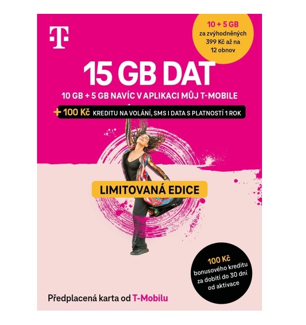 • Balíček obsahuje 10GB s obnovou + 5GB navíc na prvních 30 dní zdarma, datový limit 5 GB navíc je nutno aktivovat v aplikaci Můj T-Mobile
